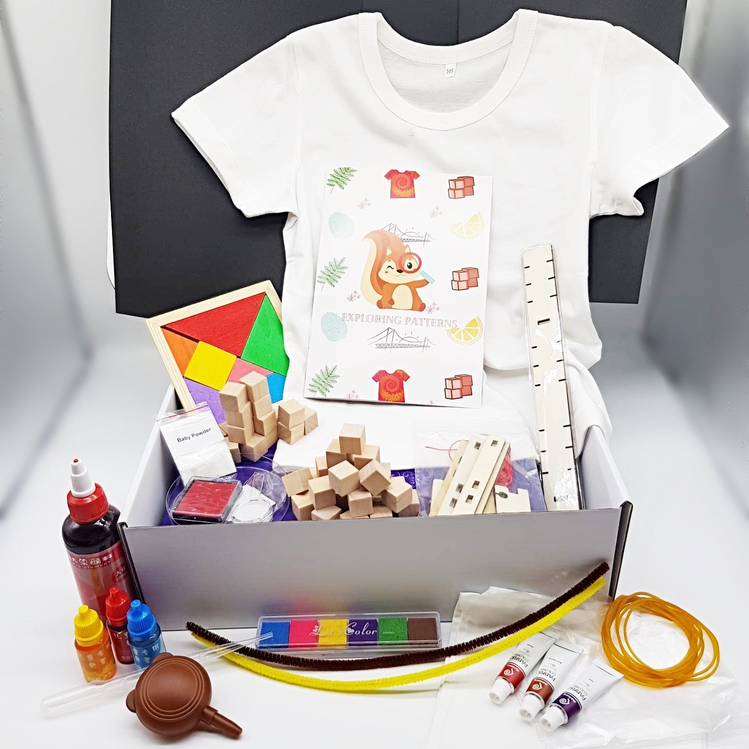 In this box, we explore the world of patterns, starting from the patterns on our bodies! Find out more about your fingerprint and create your own fingerprint craft. Then, we go on to learn about patterns in nature, structures and in Math and Science. You even get to make your own tie dye t-shirt!